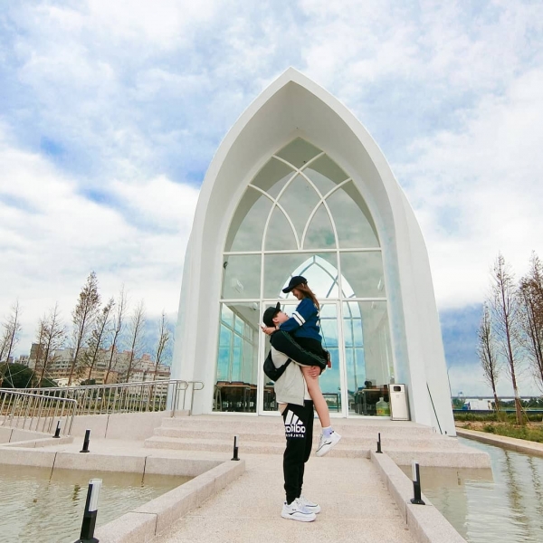 桃園又有新IG打卡點啦~目前似乎還沒有很多人知道,佇立在莊敬大池旁,才剛完工不久的夢幻純白水上教堂,不論白天或是傍晚,教堂與藍天倒映在波光粼粼的水面上,比畫還美的浪漫場景,吸引不少經過的旅人們駐足欣賞,經過口耳相傳,讓這座皇家薇庭婚宴會館之前還沒開幕就先爆紅!