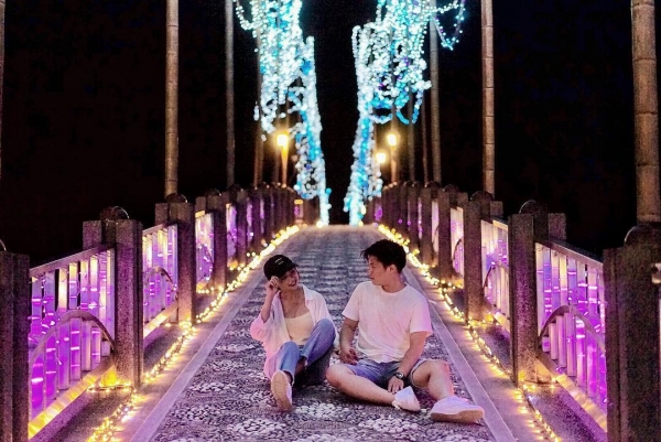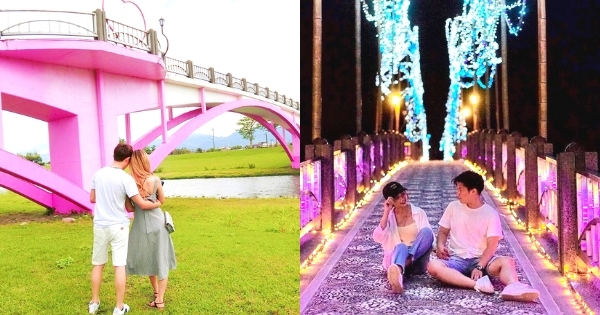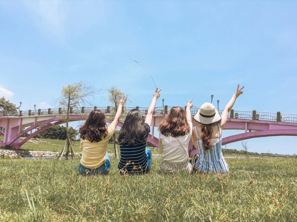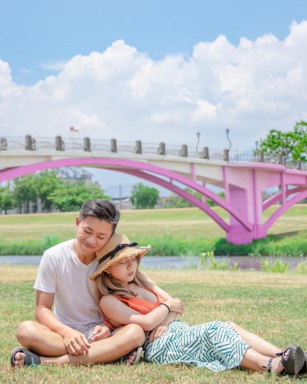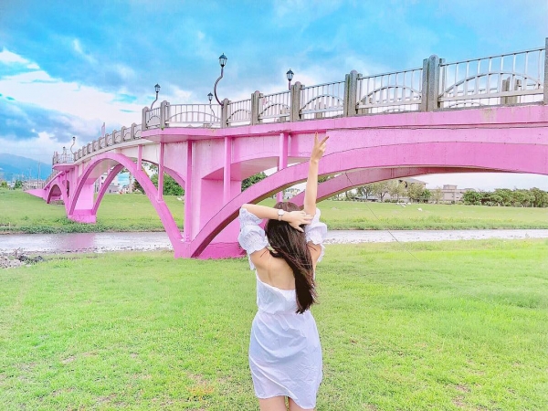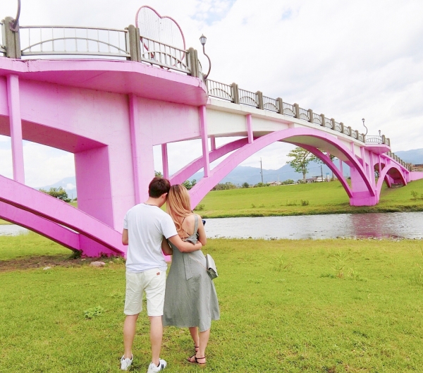 洪堰風景區內也有一座粉紅情人橋,粉紅橋、綠地、藍天,搭配著遠方山嵐,風景如畫一般美麗~