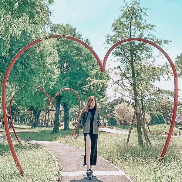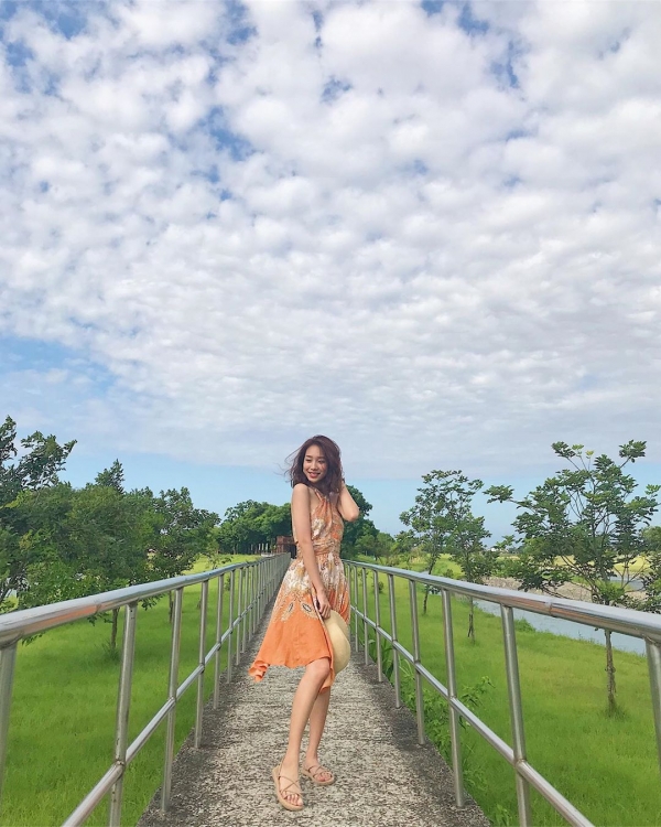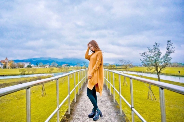 站在安農溪分洪堰的水門中央,搭配綠油油草地及河水,拍起來好好看耶