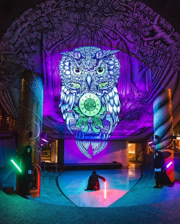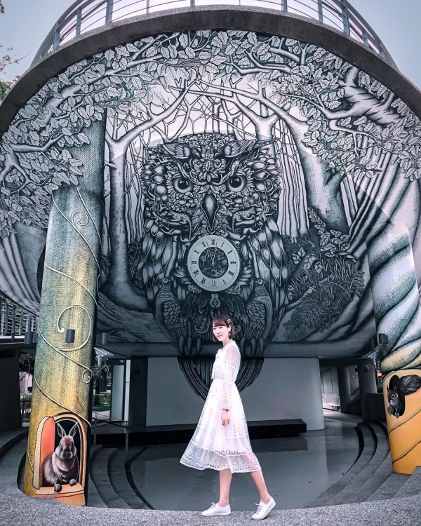 位於興大校門旁的「頂橋仔新公地」近期多了一幅3D夜光彩繪-時光森林,以領角鴞為主角,由十位藝術家聯合彩繪而成!除了彩繪圖之外,校園裡還隱藏了迷你台灣池、巨大戰機,吸引了許多攝影愛好者前來拍攝!