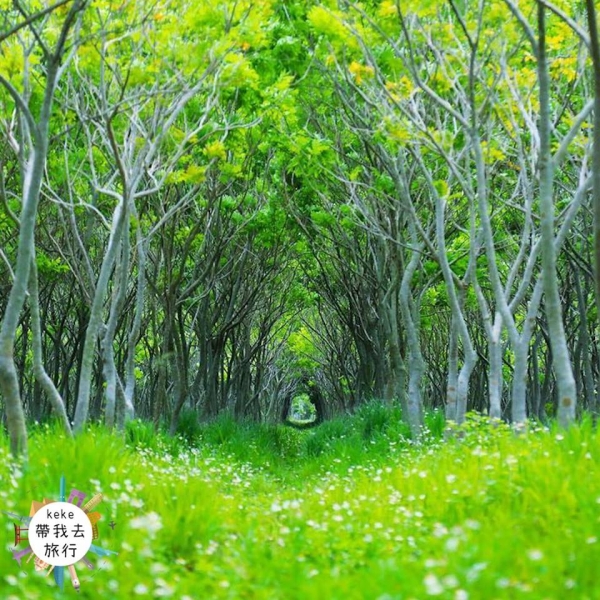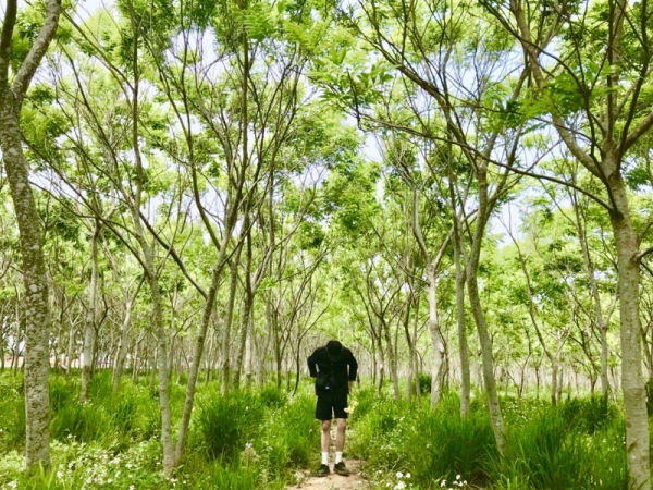 這片神秘的森林,據說是台糖的土地,種滿了一大片無患子樹。樹枝無限生長,濃密的枝葉遮蓋住天空,枝節讓樹林的最末端形成了一個圓弧狀,感覺就像電影場景小梅不小心發現通往龍貓世界的那個秘密隧道阿!