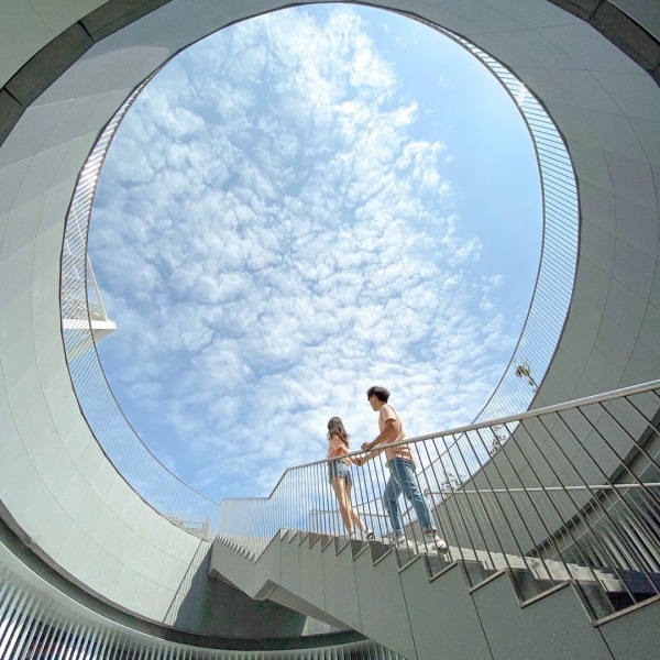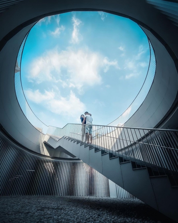 以鳳凰花轉化五角造型的「台南美術館二館」落成以來一直是IG上的打卡熱點,近期網友發現了這個「通往天國的階梯」的超仙秘境,竟然就在美術館的停車場,簡約灰白色的階梯搭配湛藍天空,真的有夠美啦!