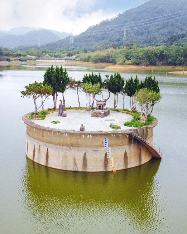 位於桃園大溪的新福圳一號池,蓄水面積約15公頃,是桃園農田水利最大的蓄水池,每年初一、十五都必須搭竹筏上島參拜,地方人士表示,當初建池塘時擲筊詢問多次,土地公指示不肯搬到新廟,只好採原地墊高方式保留土地公廟,也成為了全台唯一水中的土地公!