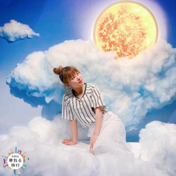 奇幻拍照區的造景有軟綿綿的雲朵與太陽,另外一邊還有月亮, 拍起來的感覺就像是真的在天空中拍照,輕飄飄的非常夢幻!