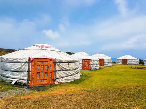 來到北海岸也可以露營!半島秘境位於新北市石門區,坐擁北海岸無敵海景,主打免設備奢華露營,除了一般露營區,特別自蒙古國引進8頂道地蒙古包,在蔚藍天空與海景的映襯下,白色蒙古包十分醒目,內部空間不小,最多可以睡4人,家具都以彩繪裝飾,宛若置身異國。