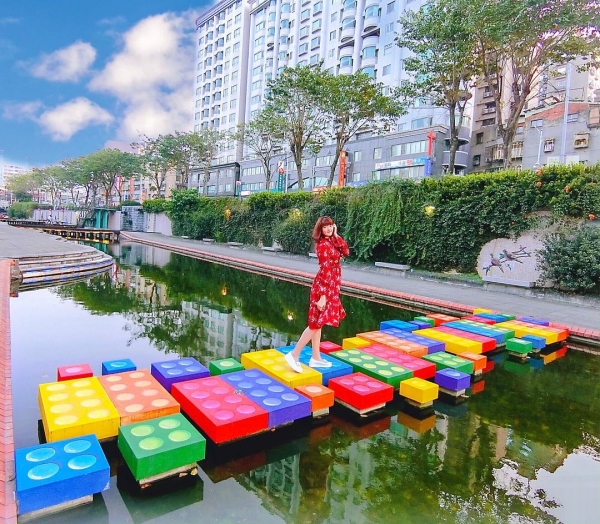 從大排廣場上的彩虹橋,走下新莊中港大排親水步道,沿途河道兩側還有美麗的3D彩繪牆,每段的彩繪主題都不相同。還有不能錯過是彩色樂高積木水上步道,或坐、或站,讓人忍不住想多拍幾張可愛的打卡美照。