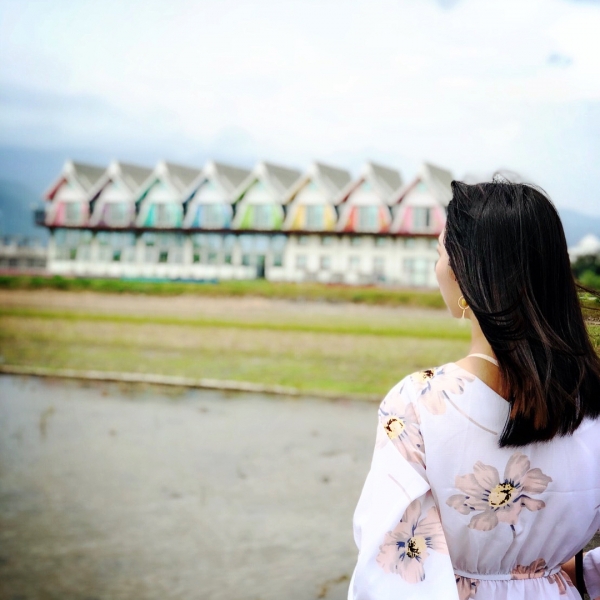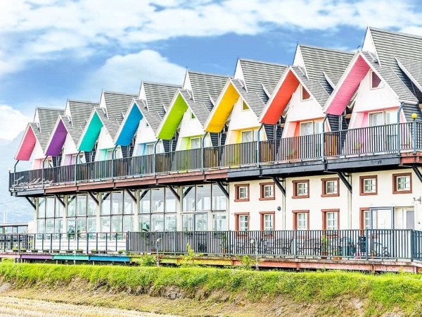 礁溪民宿「天空島上的小木屋」,從畫圖設計到裝潢工程都不假他人之手,沒有華麗裝飾,而是充滿很有溫度的手作風格。在堤岸水面上形成美麗多彩的倒影,與藍天白雲相暉映,讓宜蘭田野間有兩道美麗彩虹不論晴雨、日夜都會綻放。