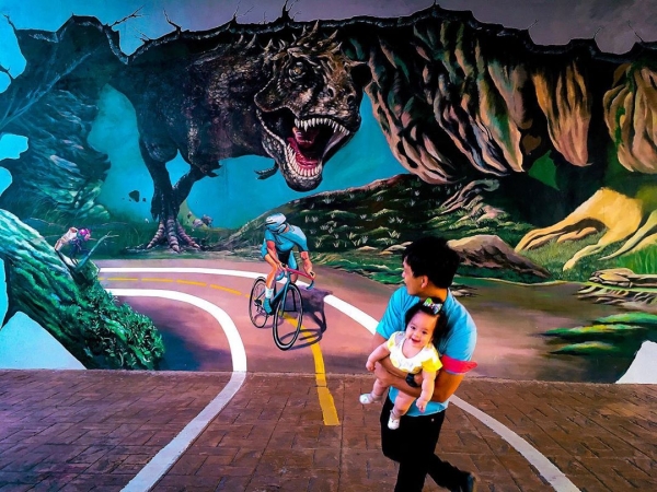 橋下的大面積栩栩如生的「侏儸紀」 3D 立體彩繪,大暴龍張著血盆大口露出銳利的尖牙追著單車騎士,緊張又刺激!
