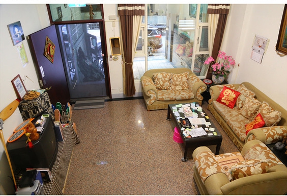 一進入卡好民宿的一樓大廳,望出去就是大門車庫方向,客廳有一組舒適好躺的沙發,還配備了一台電視,後方還有廚房可以使用,只要你是包棟住客通通隨你使用,500元包棟你真的不用懷疑!!
