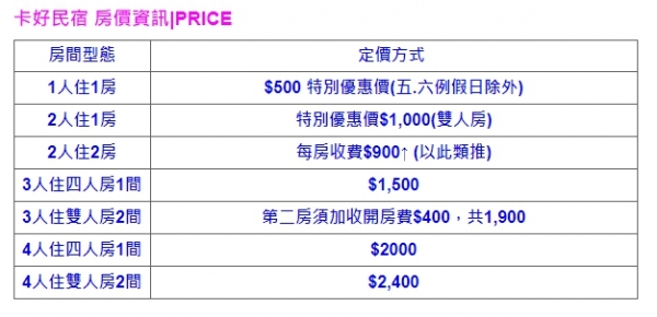卡好民宿共有4間房間,分別是2間雙人房和2間4人房,1次就接待1組客人,也就是說,如果你只有1個人入住,那就是500元住一間房間然後包下整棟民宿。