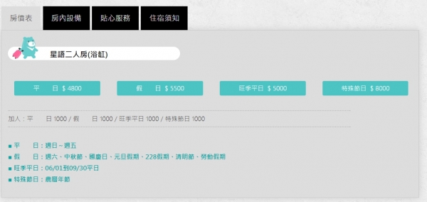 平日 NT$3600 旺日 NT$4200 假日 NT$4800 / 2人