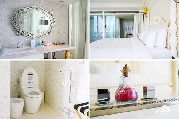 乾濕分離的絕佳設計,民宿裡的馬桶都是 TOTO 的高級免治馬桶上廁所也是一種享受~洗手台是採用灰白色系大理石材質,牆面鏡子邊框是古典點質感的花紋圖樣。浴缸旁有一瓶超夢幻的桃紅色的浴鹽,看來晚上可以來泡澡,享受一番~