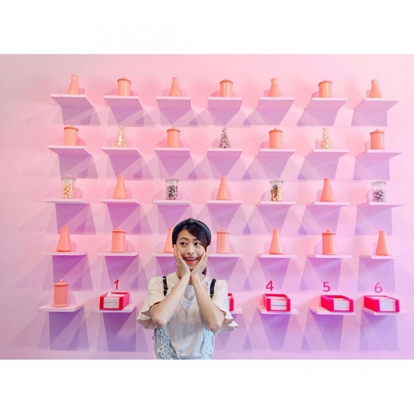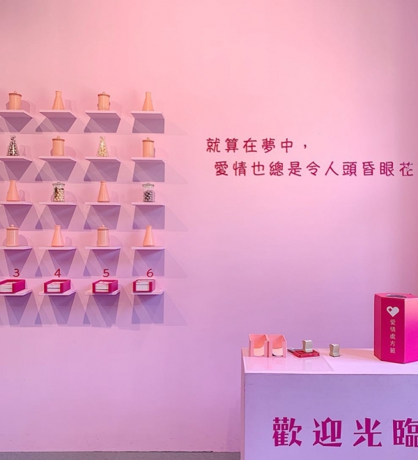 還有整面粉色牆的愛情診療室,上面放了許多試管、玻璃罐等,牆上還有「就算在夢中,愛情也阻是令人頭昏眼花。」的字,很有趣~