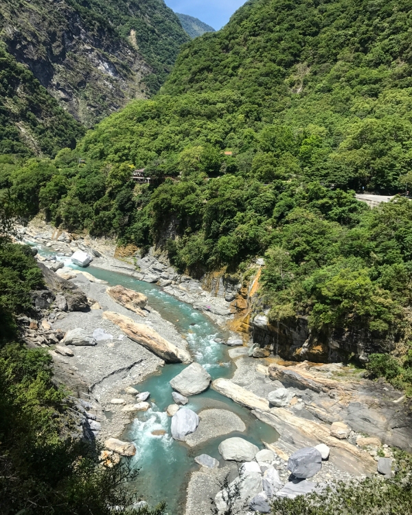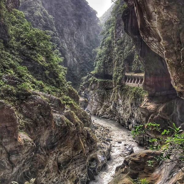 步道緊倚著高山深壑,向下俯瞰則是急湍的立霧溪水,兩岸山壁緊峙,鬼斧神工與險峻的地勢令人讚嘆震懾。