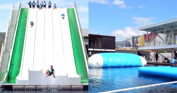 另一個讓大家超期待的玩水設施是「水上彈跳包」,從約5公尺高的跳水台一躍而下,滾到彈跳包最前端等待另一個朋友從後方跳下,前面的人就會立刻被彈飛到三米高的空中,可以跟朋友一起體驗這麼好玩的設施,真的是今年暑假的新體驗阿~