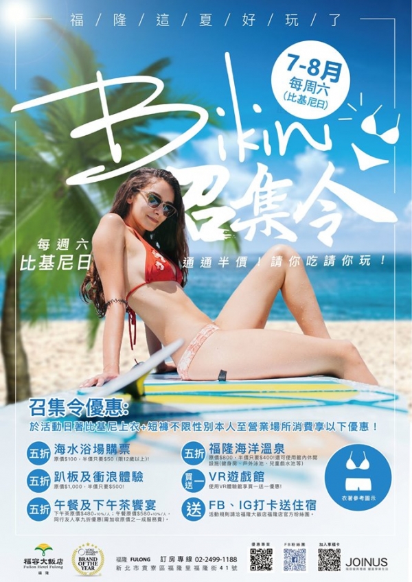 夏天就是要奔向沙灘和穿上比基尼玩水,福隆海水浴場推出「比基尼召集令」,「不限男女」只要穿著比基尼入園即可享海水浴場門票50元優惠,且上傳比基尼照到粉絲專頁或IG,獲得最多讚的得主還能獲得福隆1.6萬元住宿券!