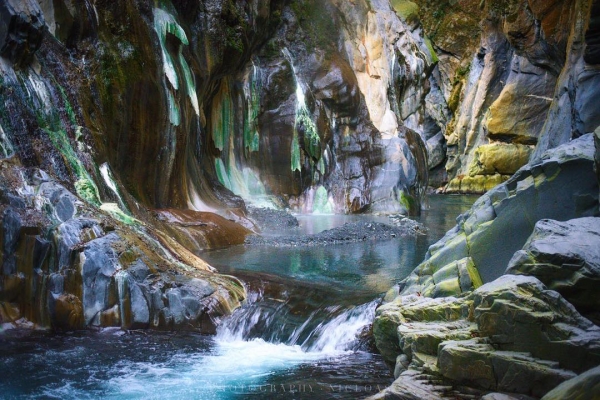 山壁上凝結的碳酸鈣結晶,因溫泉藻的附著,有了如容翠玉一般的晶透顏色。