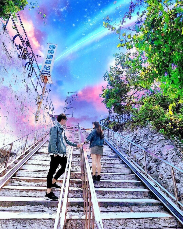 這個階梯就是現在崎頂車站最夯的點,因為很像電影「你的名字」的拍攝場景。