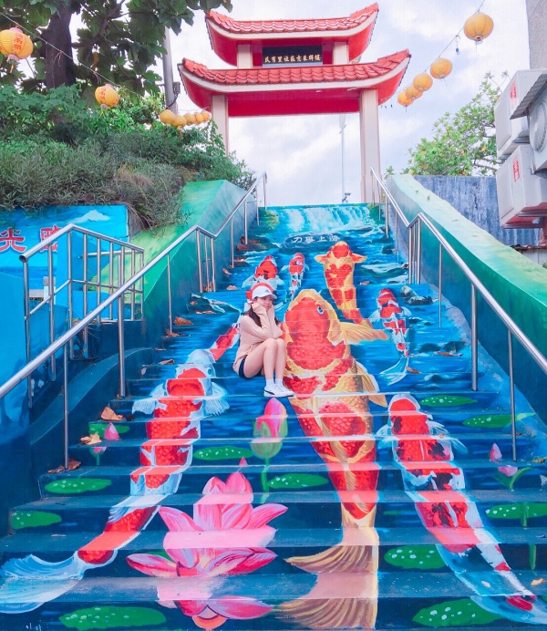 沿著路走,就可以發現沿途都有不同的彩繪,花花綠綠的吸引人走進這邊廟朝聖,這些魚好立志呀,好像是告訴我們做人要力爭上游,設立在廟前階梯,特別有意義。