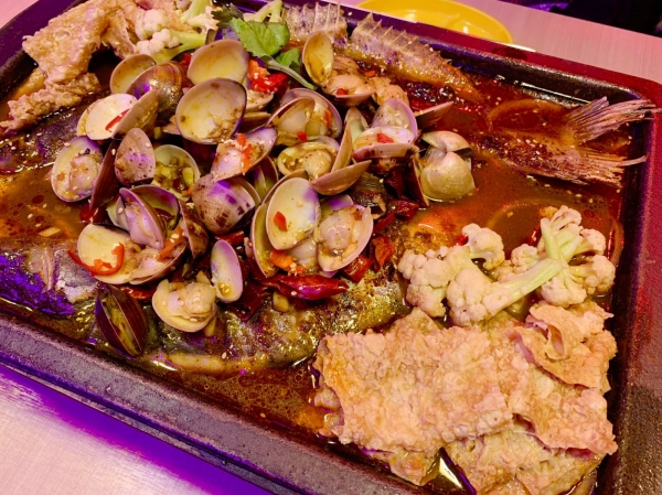 ▲蛤蠣山烤魚,這道就屬於小辣囉,真的是滿滿的爆炸蛤蠣!