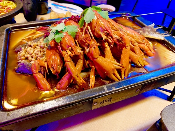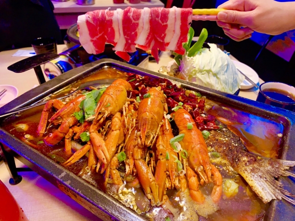 先品嚐最上頭的的超入味龍蝦,勁辣的麻辣感喝上一 口啤酒,再品嚐下方的炭火烤魚火鍋,簡直是人間享受。