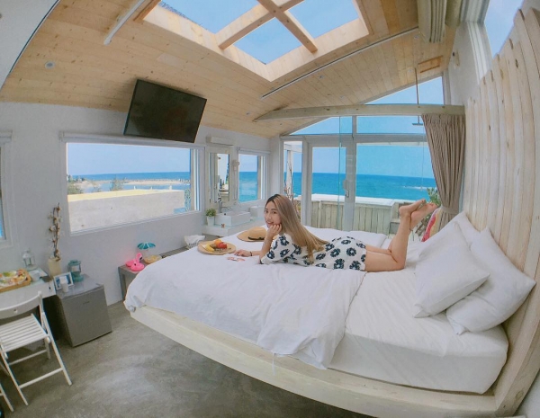 房間是挑高無隔間的設計,躺在床上就能看見外面的碧海藍天~