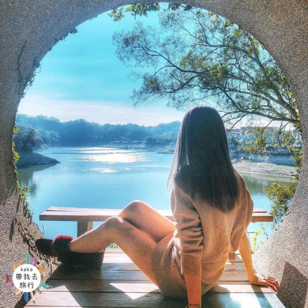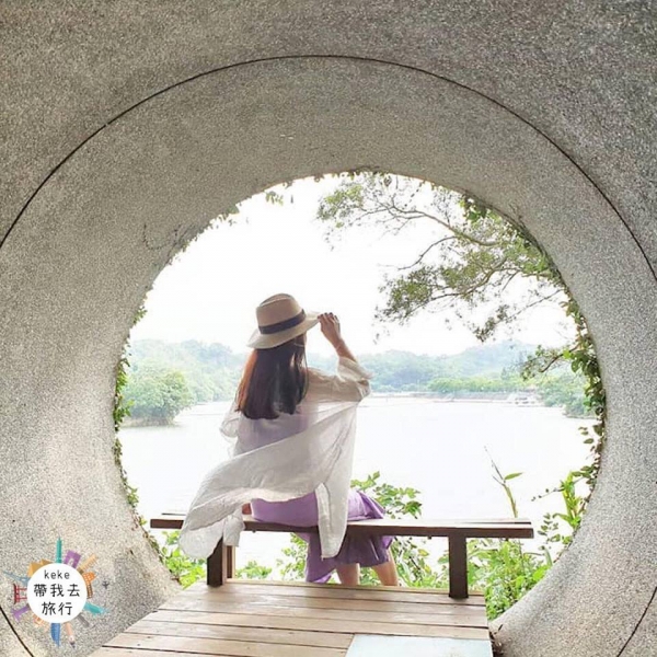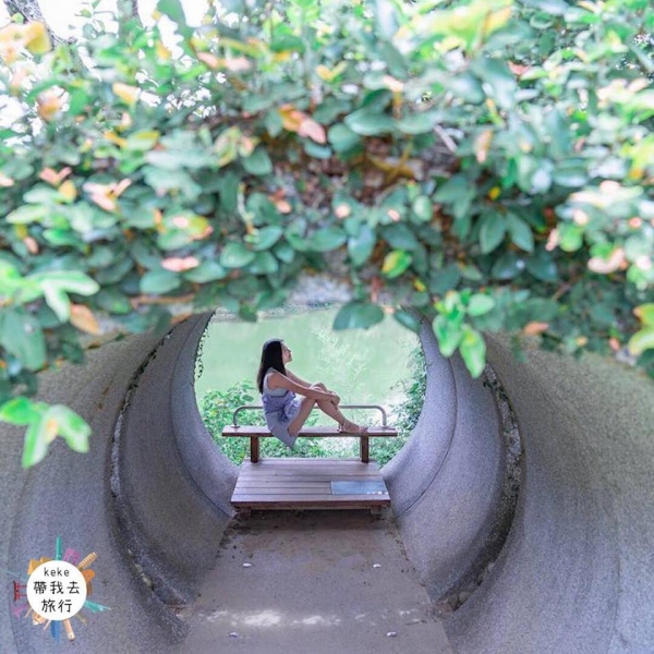 島上除了綠意盎然,讓人放鬆的環境,還有大大的水管洞穴,簡單半圓形,藤蔓攀爬在上,一條長板凳,走進這個半圓裡,欣賞唯美的湖上風光,拍出來的照片也都很有感覺呢!