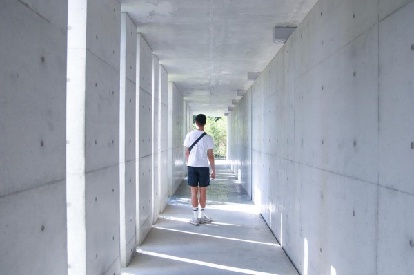 從入口處至主館,建築師廖偉立先生設計一段半戶外廊道,讓參觀者走在半戶外廊道上感受陽光灑進廊道內形成的光影變化,也能慢慢漸進的感受美術館建築之美。