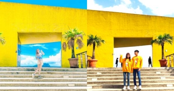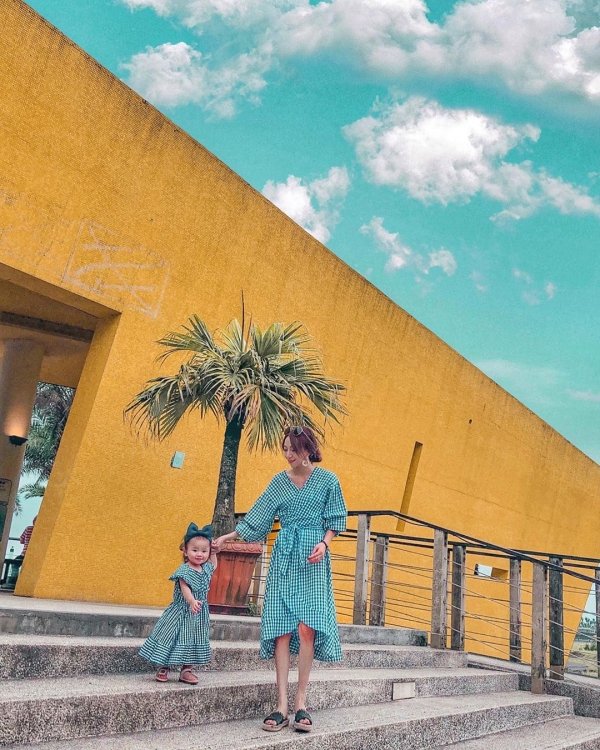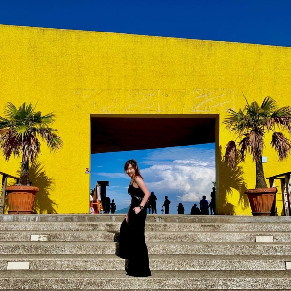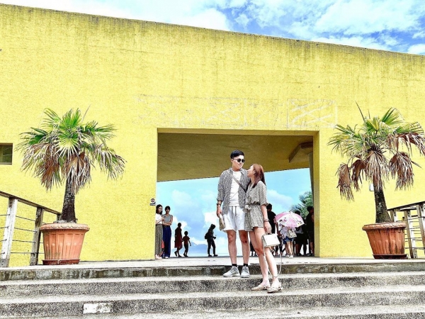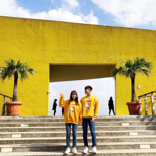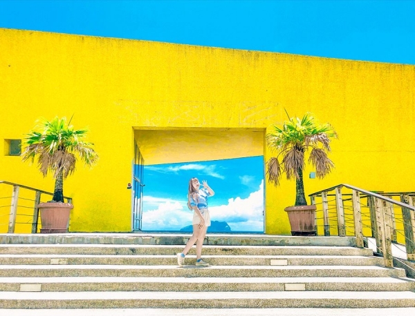 黃色外觀的建築和藍天白雲剛好是對比色,一旁的椰子樹還有天上的彩色飛行傘讓人很有度假的感覺(附近剛好是外澳飛行傘基地,所以天氣好的話可以看到很多遊客會從山上乘坐飛行傘到沙灘區降落)