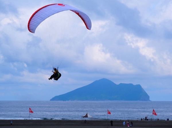 拍照同時.發現有飛行傘降落於建築後方的沙灘處,讓人覺得很驚喜!原來附近就是外澳飛行傘基地,蠻多遊客會從山上飛到沙灘處