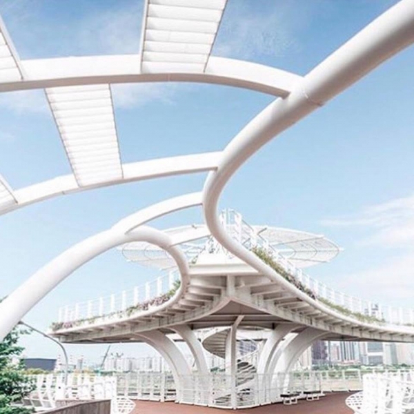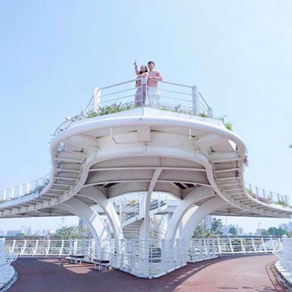 整體造型以輕巧的弧線姿態,像蔓延的藤蔓般穿越在生硬都市叢林中,軟化都市景觀。加上頂端設計空中花園,夜晚搭配上燈光效果,除了提供在橋上行走或騎乘單車的民眾們照明,也點綴了高雄市的夜晚,成功塑造一個可供停留休憩、並充滿自然風情的中心區。