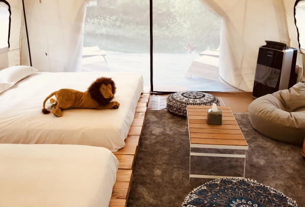 除了帳棚本身的設計之外,內部的傢俱也很精緻~採用原木傢俱,吃的、用的一應俱全,加上飯店特別設計的燈光,日夜都超美~絕對有置身國外的感覺!