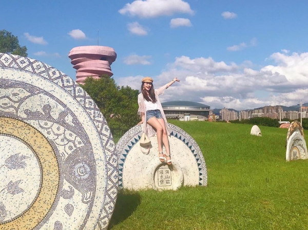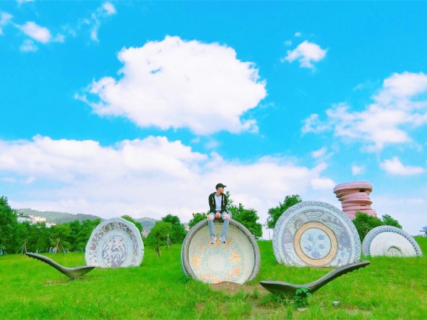 朝聖IG上巨大的陶瓷打卡景點來到鶯歌,許多精緻的陶瓷杯盤豎立在青綠草皮上,讓人來當「真人版杯緣子」,也像是被藝術家遺忘的作品。