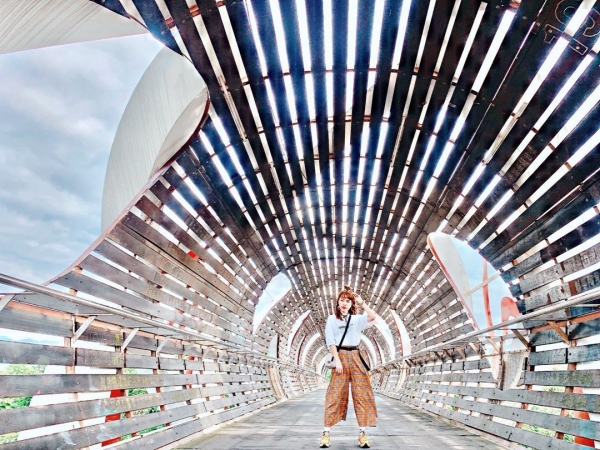 路線上有這座頗具特色的景觀橋「龍窯橋」,白天可以欣賞到造型奇特的外觀全貌,光線穿過木板間的縫隙灑下,不同時間會有不同的光影變化。夜晚時還會點燈,又是另一種不同的面貌呈現。