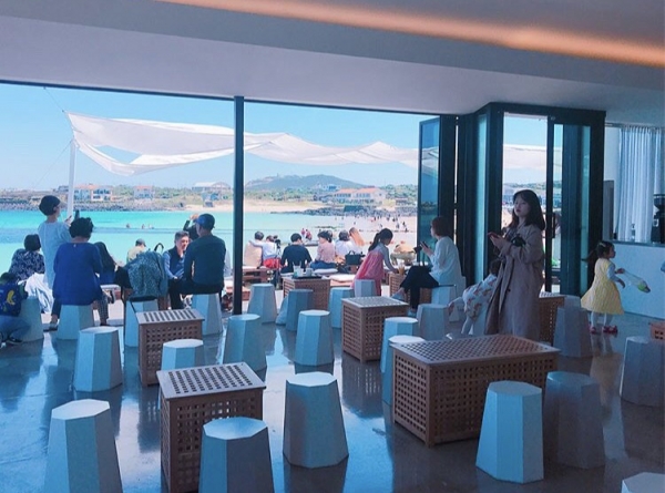 旁邊就是海水浴場,海水玩累了之後,靜靜的坐在這麼文青的咖啡館望著黃昏的海洋,好好的享受濟州島的海風與夕陽的美麗,店內有個非常特別的設計,可以利用拍攝的角度,像是把人裝進復古的天線電視機,是來到咖啡漢拿山必拍的特色~