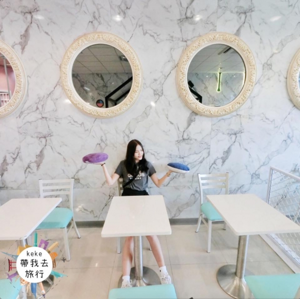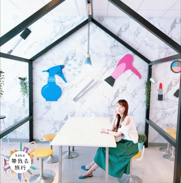 大理石磚、淡粉色的牆面,每面牆上的裝飾主題都不一樣,口紅、粉撲、指甲油、吹風機、離子夾,還有歐式雕花的圓鏡,再配上tiffany藍椅墊的白椅,整個就很適合浪漫系的女孩們!