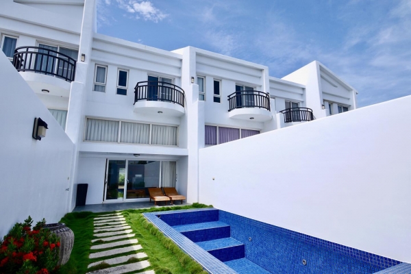 穿越過花園 映入眼簾的是一整排潔白外觀渡假風味建築,Happiness Villa部分有4人獨棟泳池villa、6人獨棟泳池villa、8人獨棟泳池villa