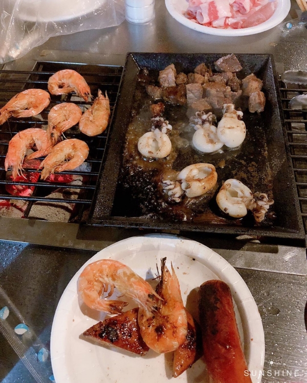 食材方面無限量供應,基本款的牛、豬、雞通通都有,海鮮方面就真的很豐富蝦子、秋刀魚、孔雀蛤、蛤蠣、小章魚、魚下巴等等..