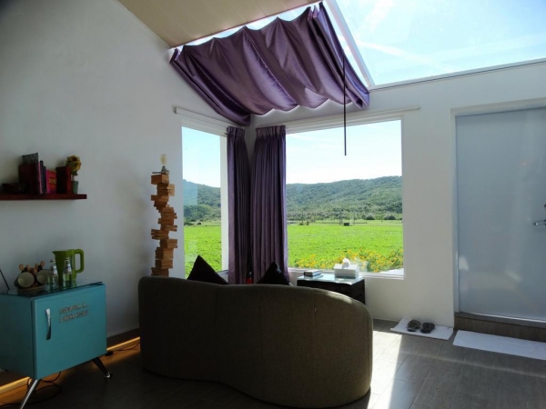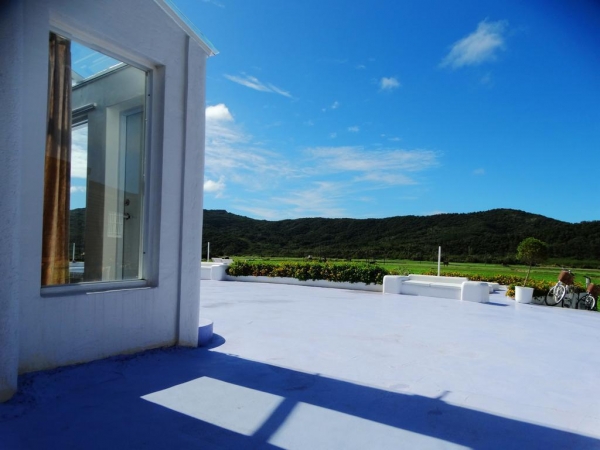 這間超純白小屋連外頭的裝潢也全部都是純白色與藍色為主,在田野間的它超顯眼,可是又不會讓人覺得很突兀,來到這裡好好放鬆,偶爾看看鄉下的景色也是一件很享受的事啊~