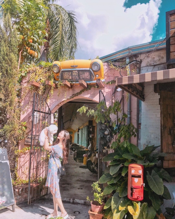 除了門口上頭的一半的車頭,旁邊還有一台真真正正的超復古小噗噗,小小的米白色小車車停在門口,真的是吸引了滿滿的目光,超吸睛的造型就是最好的宣傳廣告!超可愛的外型也讓很多人駐足拍照~