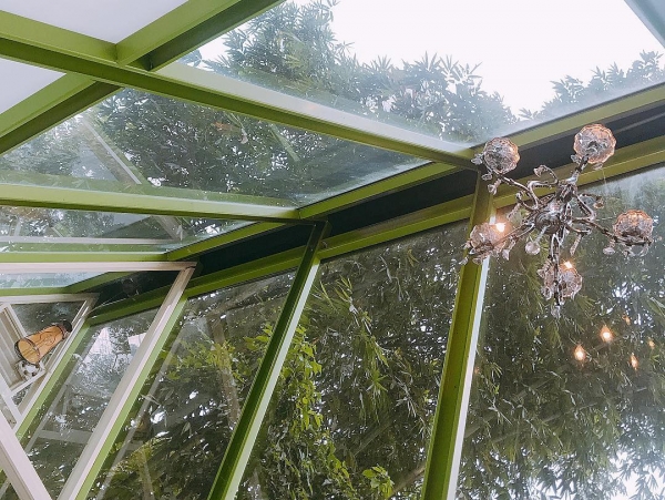 玻璃屋內還有精緻水晶燈,白天光線灑進屋內,好浪漫喔!