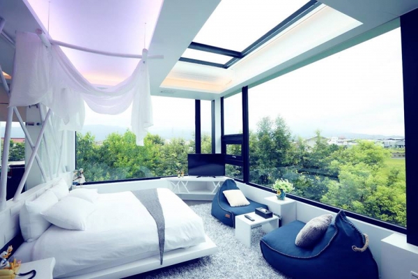外觀看起來相當有設計感的水岸楓林民宿,混合著法式時尚與歐風渡假感,這座隱身於椰林、楓樹與碧水間的美麗民宿,有著多面大片落地玻璃窗,從外看進去相當前衛,由內看出去則擁有相當遼闊的景觀視野,玻璃屋就是怕熱又想看風景的最好選擇~水岸楓林的房型相當多樣化,每間風格都不一樣、而且超精緻...真的每間都想住過一遍那種!