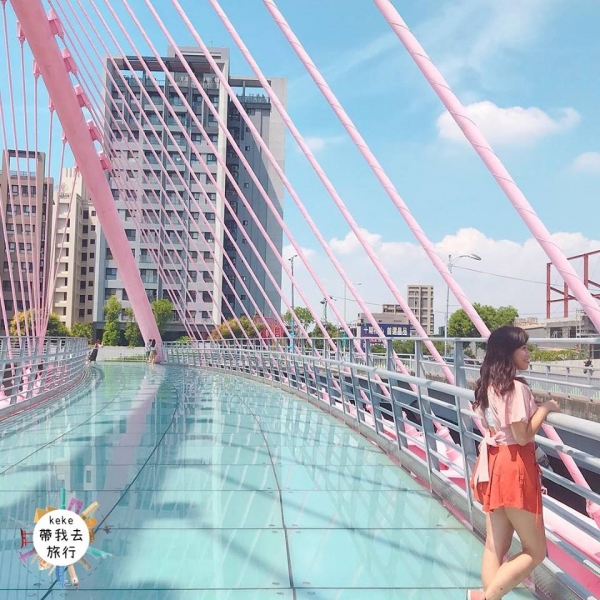 隱藏愛心的浪漫粉色調,由無數條粉色鋼索形成的斜張橋,橋面則是大面積的玻璃鋪陳,在陽光的折射下形成上下對稱、完整的一顆愛心,從橋的另一端看過去則像是豎琴,不管白天或晚上拍起來都超美的!