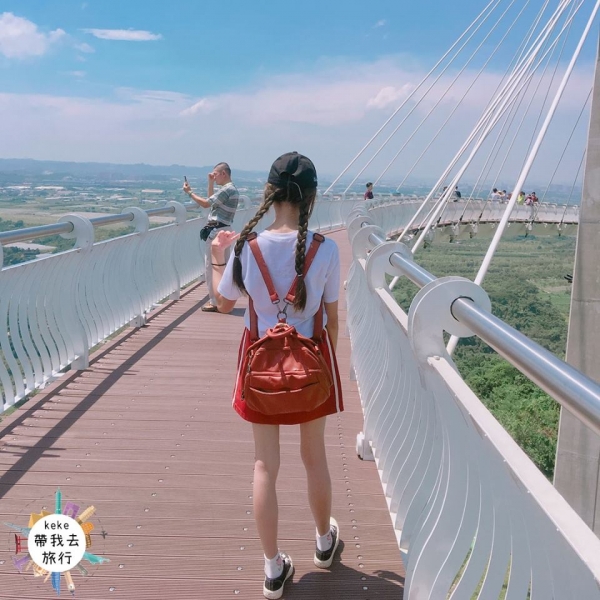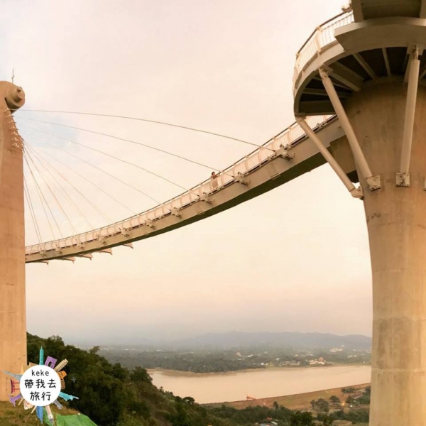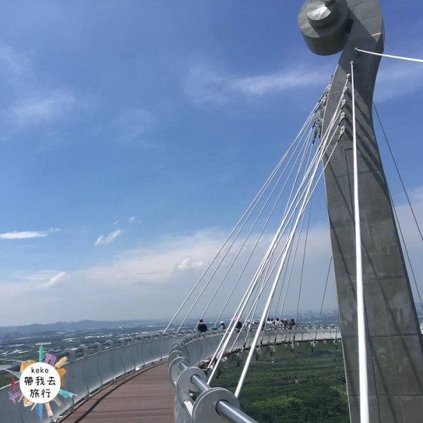 崗山之眼天空廊道橋塔高41公尺,立在小崗山的西緣,地理位置很好。一邊欣賞提琴塔柱與優美的身影,一邊下瞰阿公店水庫風光,高雄的風景一覽無遺啊~地板有一部分是玻璃做的,可以看到下面,腳底板可能會癢癢的唷!風大的時候橋還會微微晃動,真的是會有點刺激呢!