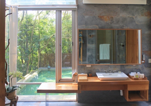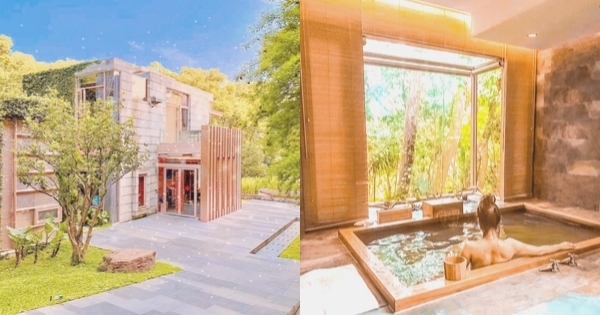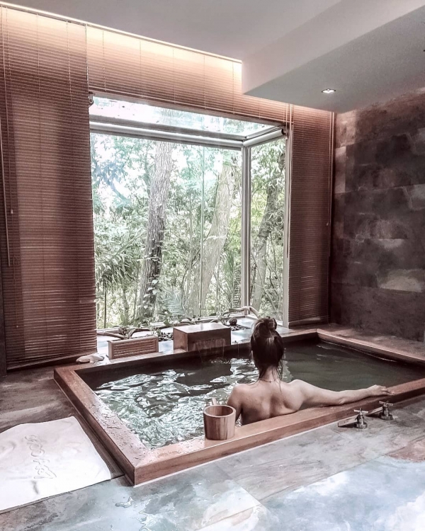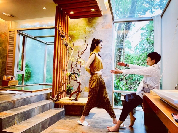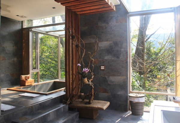 來到泡湯的湯屋部分,利用大片玻璃,運用大自然採光,以及被綠樹環繞而成的感覺,讓人在泡湯時能感受到自然的氛圍!泡湯池都是採用山泉水,真的不輸正統溫泉會館!是不是超棒的~