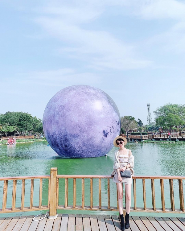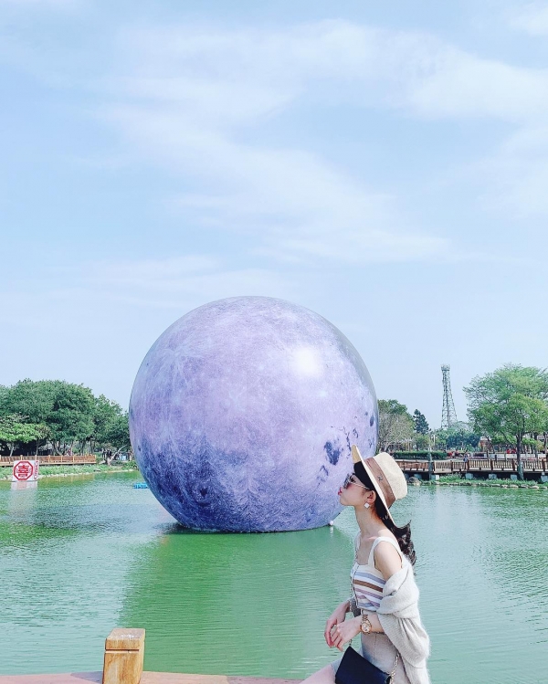 巨型月球是位於溪洲公園的裝置藝術,入夜後光後呈現精彩光雕!也太可愛了吧~好像是外星人的星球掉入水中似的!