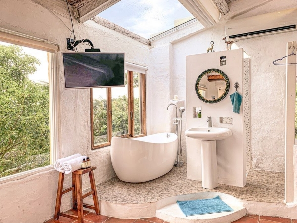 而最出門的就是這個超好拍的浴室啦!白天可以盡情享受陽光晚上還可以仰望星星,而且整個浴室都是做成很可愛的圓弧型,讓整個房間可愛到不行,這邊真的是一個必打卡的景點呢!怎麼拍怎麼美,會不會洗澡就變成一種要精心打扮的事呢哈哈哈