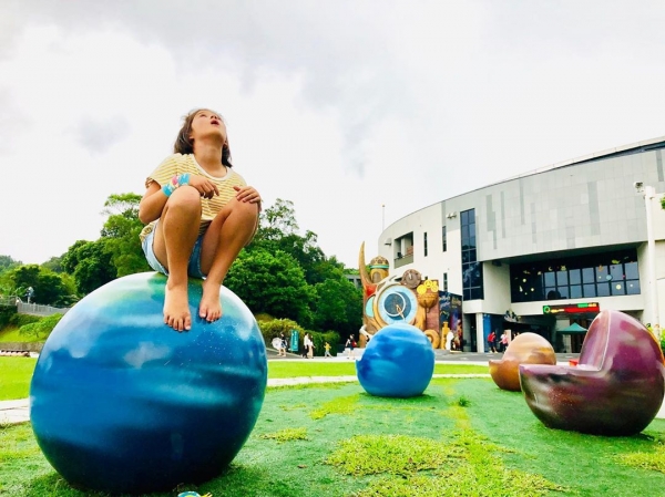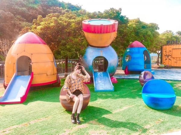 大內本身有一間天文館,是一個充滿教育意義跟互動劇場的教育園區,但是在他外頭的這片草地上,有一個超可愛的親子遊樂場,裡面的溜滑梯、椅子、躲貓貓涼亭,通通都是做成星球與火箭的樣子,色彩又繽紛,真的超Q超可愛的啦!