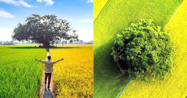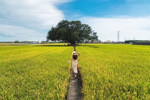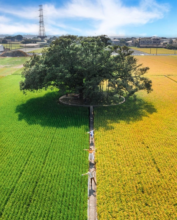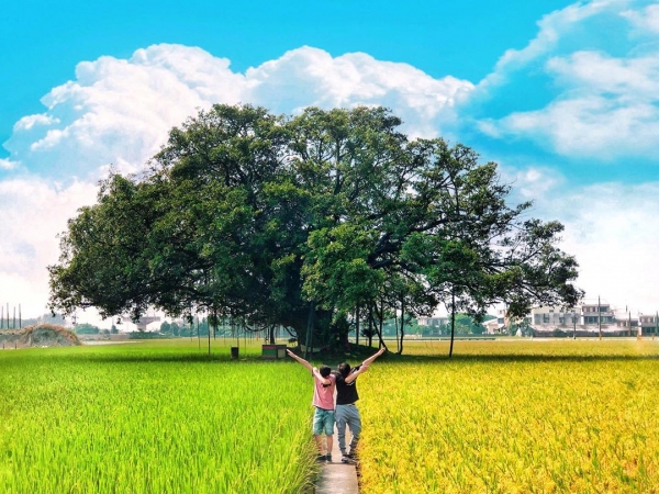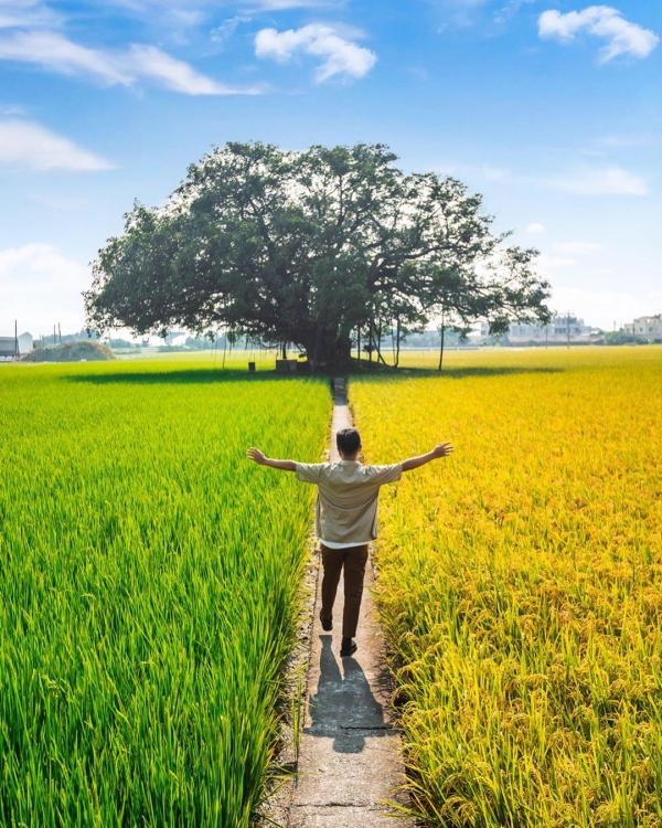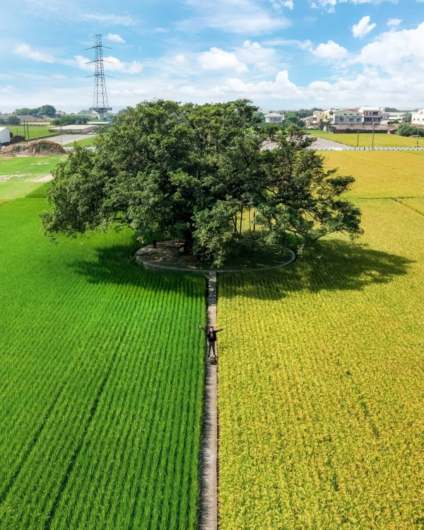 彰化最近真的~太!狂!了!!!除了田尾公路花園那一區有超多好拍的花花草草,還有這片金綠色的雙色稻田~一邊是翠綠、一邊是金黃,正中央還有一棵對地方來說相當具有意義與回憶的百年大榕樹,簡直是彰化秋天最美的景色~