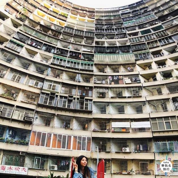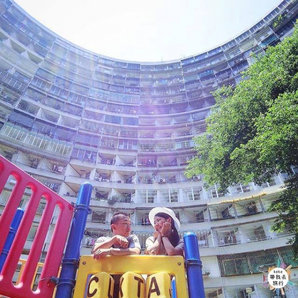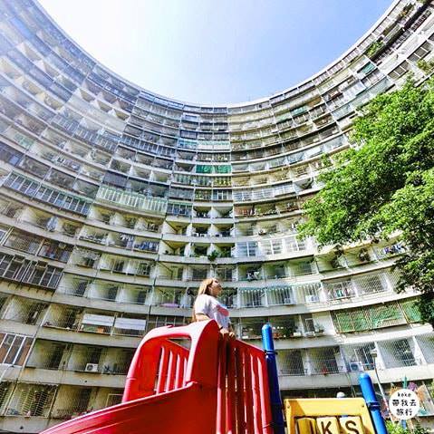 而最常拍照的角度就是以社區大樓為背景,站在公共遊樂設施上,從下午上拍的畫面,不管你有沒有去過香港,都聽過一個觀光客必拍的,就是「益昌大廈」。這裡就像香港建築的縮小版呀~~所以近年來果貿社區會爆紅就是讓人有種不用花錢出國,就能拍出出國的感覺。